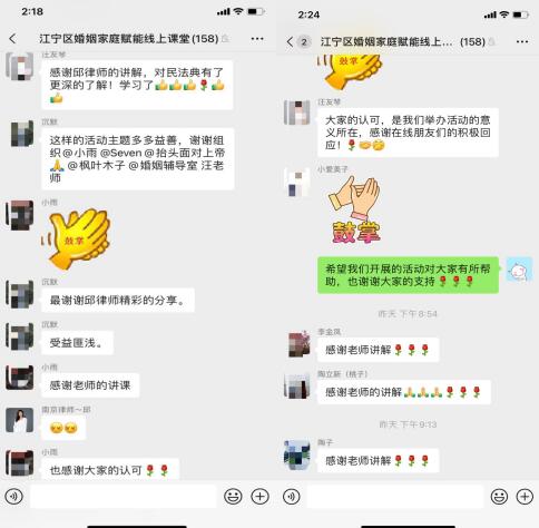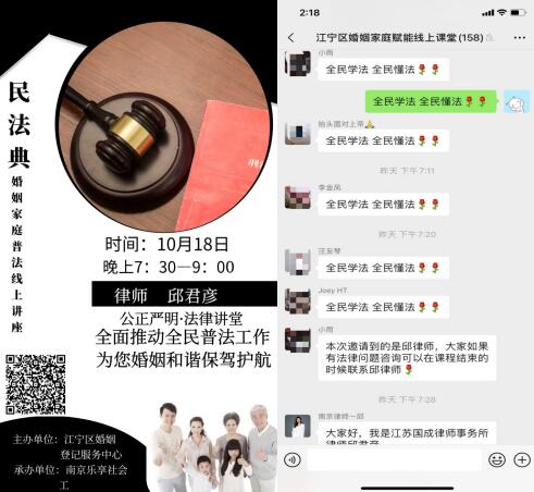 為進(jìn)一步做好《中華人民共和國(guó)民法典》“婚姻家庭篇”普法宣傳,提升家庭的法律知識(shí)水平及家庭糾紛調(diào)處能力,10月18日晚,江寧區(qū)婚姻登記服務(wù)中心聯(lián)合南京樂享社會(huì)組織舉辦了“《中華人民共和國(guó)民法典》婚姻家庭篇”線上普法課堂,近150人參與了聆聽。
