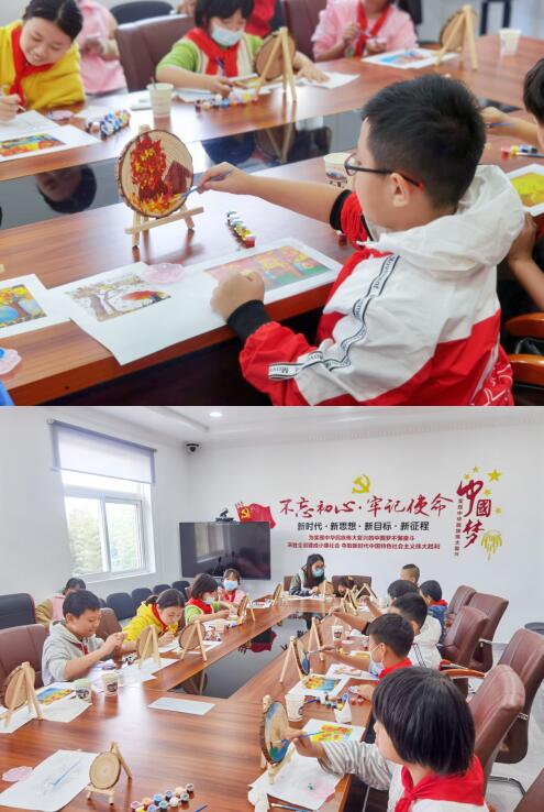 作畫開始。孩子們和家長們一起動起手來,描畫框、上顏料,用畫筆和年輪對話,發(fā)揮想象,將內(nèi)心所想呈現(xiàn)在木樁上,創(chuàng)作出屬于自己的秋天!