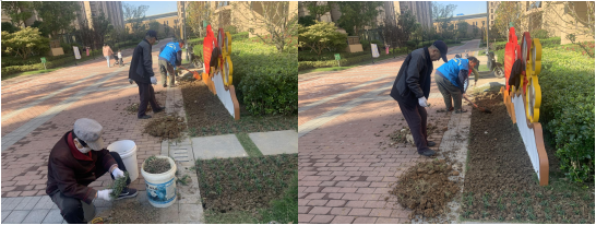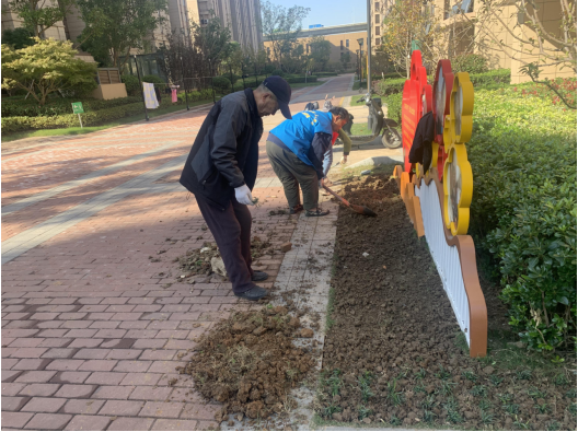 活動期間,大家有的用鐵鍬翻地、有的挖坑撒種,各個環(huán)節(jié)銜接有序,配合默契,利用手上的修剪工具,給綠化植被造型,“整容”;給已枯萎的花草進行補種;同時,將參差不齊的樹叢細心修補。經(jīng)過修剪后的樹叢橫平豎直,植被在被修剪后增加了通風與透光,陽光一照進來,顯得格外精神,道路兩旁的花朵也爭相斗艷,社區(qū)面貌換然一新,整齊美觀。風兒輕輕,草兒茵茵,烈日下的“園丁們”辛苦勞作著,在社區(qū)與他們的努力下,小區(qū)的花草書木熠熠生輝,充滿了生機,保證了植物良好生長。