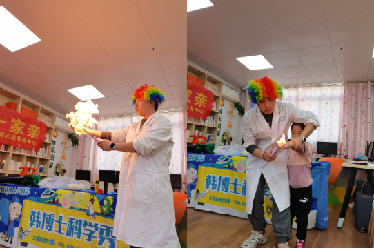 第三個(gè)科學(xué)秀是“烈焰掌中火”。孩子們一個(gè)個(gè)驚訝的看著工作人員冒火的手掌,瞪大的眼睛仿佛在說(shuō)“難道這就是傳說(shuō)中的火云神掌?”。孩子們都想知道這是為什么,也都想親身體驗(yàn),讓自己的手掌也變得這么神奇。