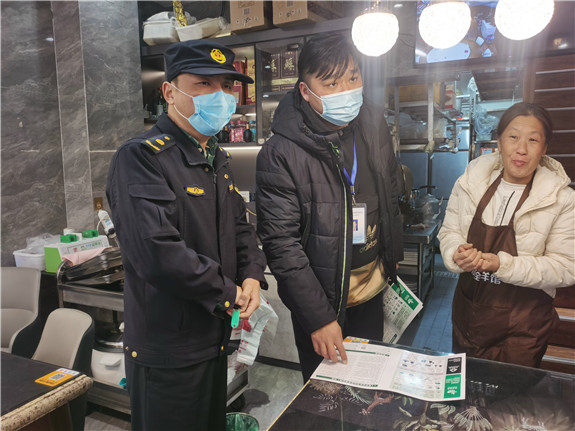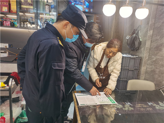 在檢查過程中,工作人員首先檢查了商鋪的廚余垃圾分類情況,也實(shí)地察看了店面內(nèi)的分類垃圾桶的使用情況,督促指導(dǎo)經(jīng)營業(yè)主做好垃圾分類工作,并向經(jīng)營者發(fā)放了《南京市生活垃圾管理?xiàng)l例》宣傳冊,宣傳生活垃圾分類的各方管理責(zé)任和處罰標(biāo)準(zhǔn),提高商戶思想認(rèn)識。