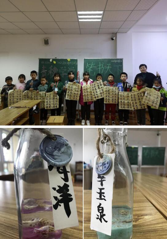 上周,青穗學(xué)堂帶領(lǐng)同學(xué)們制作了精美的星空瓶,這次又在原本的基礎(chǔ)上進(jìn)行二次創(chuàng)作,注入不同顏色的定型膠水,讓瓶內(nèi)的景觀變成上下兩層,再加入珍珠等配飾,靜置等待成型。成型過程中,老師引導(dǎo)同學(xué)們給自己的星空瓶起一個名字,很多同學(xué)發(fā)揮了自己的奇思妙想,表達(dá)了美好愿景,如翠綠泉、星辰大海……老師邀請同學(xué)們用毛筆把自己起的名字寫在名稱牌上。為了讓寫出來的效果更好,大家先用毛筆在練習(xí)紙上進(jìn)行預(yù)先練習(xí)。在講解毛筆用法的過程中,老師了解到同學(xué)們雖然在三年級發(fā)了毛筆書籍,可是沒有開展過任何書寫課程,拿筆的手法形色各異。老師對握筆姿勢進(jìn)行一對一糾正,讓同學(xué)們能夠正確使用毛筆,寫下自己的妙想與奇思。