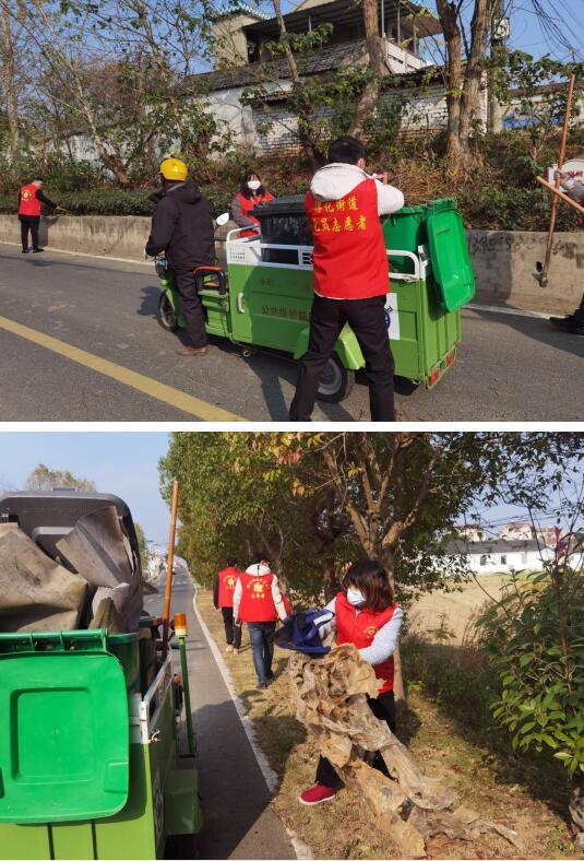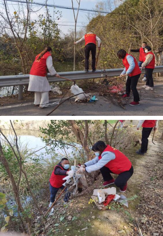 另一組成員將路邊雜亂堆放的垃圾進行了清理,把各類垃圾分類裝袋,其他成員則使用竹扒、長竿等工具,對河道、池塘水面上的浮藻、塑料袋、水瓶等進行了打撈。