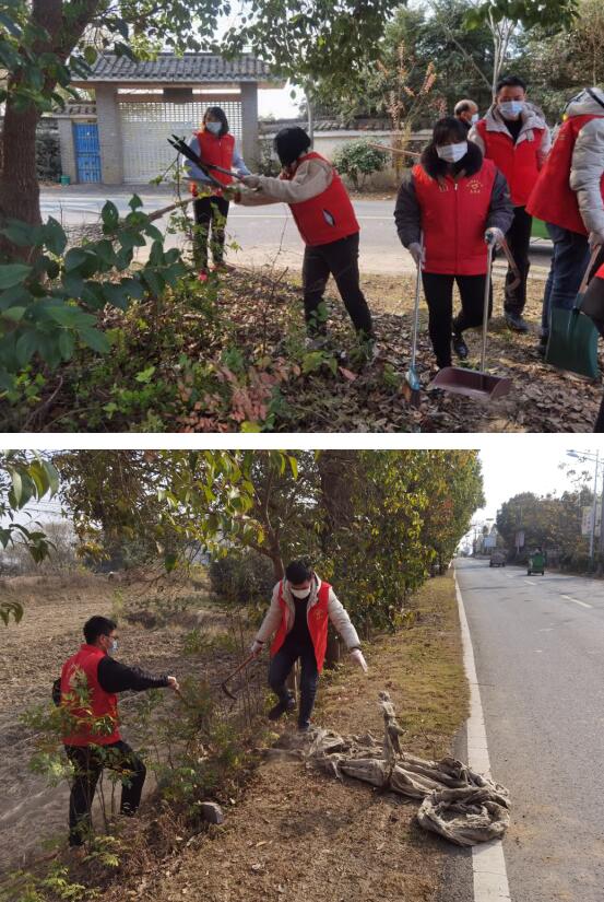 大家分成數(shù)個小組,分頭行動。一組在村莊廣場、綠化帶中對雜草樹木進行修剪,將干枯的以及伸出道路兩旁影響通行的枝條都處理掉,提升美觀度,消除安全隱患。