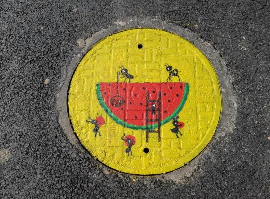 志愿者以事先創(chuàng)作好的紙質(zhì)畫為基礎(chǔ),先用粉筆在井蓋上繪出輪廓,然后讓小朋友們拿著毛筆或小刷子,用顏料一點(diǎn)點(diǎn)上色、修正.....小朋友們分組合作,或蹲或坐在井蓋邊上,耐心細(xì)致地以井蓋為“畫紙”進(jìn)行創(chuàng)作,連續(xù)幾小時(shí)的精心創(chuàng)作之后,昔日毫無(wú)生氣的井蓋,都穿上了色彩靚麗的新衣裳。一幅幅色彩靚麗、風(fēng)趣活潑的井蓋創(chuàng)意畫,讓平時(shí)不起眼的井蓋變得格外引人注目。