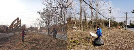 當(dāng)天,面對茂密枯萎的雜草,東陽社區(qū)工作人員和工會(huì)志愿者踐行雷鋒精神,積極參與,自帶割草機(jī)、鐮刀、掃帚等工具,共分成3組一起互相協(xié)作。大家紛紛擼起袖子一起行動(dòng),有的除雜草、有的撿垃圾、有的清掃路面,你前我后,一個(gè)跟著一個(gè)的腳步走,不放過任何一個(gè)死角。冬天的嚴(yán)寒沒有冷卻大家集體行動(dòng)的熱情,社區(qū)工作人員和志愿者們干的熱火朝天、汗流浹背,鞋、褲腿上都粘上了厚厚的泥土,但每個(gè)人都毫無怨言。