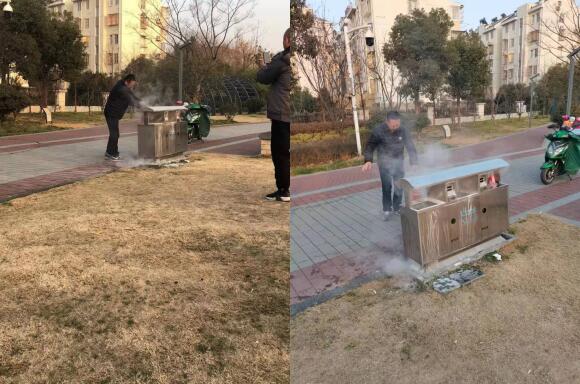 12月22日下午4點04分,居民在微信群里向社區(qū)工作人員反映市民廣場的垃圾箱著火了。社區(qū)工作人員接到通知后,第一時間和保安帶著滅火器前去滅火。10分鐘后,社區(qū)工作人員就用滅火器將垃圾箱的火苗撲滅,社區(qū)工作人員還不放心,擔心里面有余火復燃,圍著垃圾桶觀察了一會,又對準垃圾桶里底部進行噴射,確認不會復燃后才返回。
