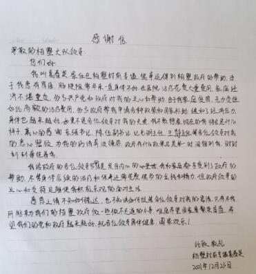 袁春英患有胃癌和腸梗阻,常年來一直身體不好,在醫(yī)院治療花費了大量的費用,家里的經(jīng)濟負擔很重,無力負擔高額的治療費用。了解到她的情況后,柏墅村積極幫助她申請各種政策和國家補助,希望可以緩解她的經(jīng)濟負擔。“多虧政府幫我申請了很多補貼,緩解了經(jīng)濟壓力,現(xiàn)在的身體也越來越好,如果不是各位領導對我的關愛,我不敢想象現(xiàn)在的我將會是什么樣子。”袁春英在自己的手寫感謝信中寫道。
