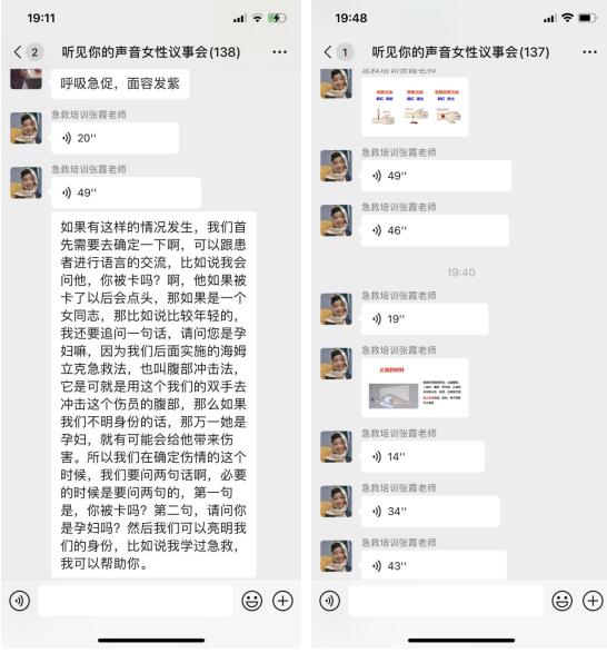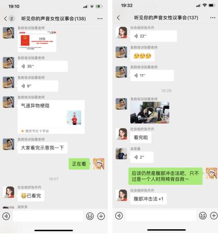 “海姆立克急救法又稱海姆立克腹部沖擊法,最常見的就是在呼吸道堵塞異物時使用。左手握拳,右手從前方握住左手手腕,使左拳虎口貼在患者胸部下方,肚臍上方的上腹部中央,形成‘合圍’之勢,然后用左拳虎口向患者上腹部內(nèi)上方猛烈施壓。大家可以看一下視頻講解,練習(xí)一下。”張霞老師講解完基礎(chǔ)知識后又結(jié)合視頻案例與居民們進行互動,整個群內(nèi)氣氛活躍、熱烈。
