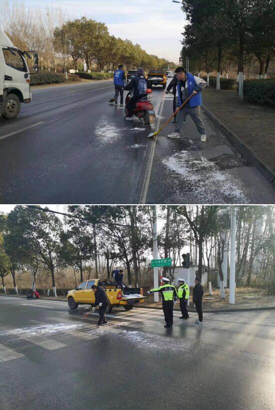 發(fā)現(xiàn)此情況后,南京市江寧區(qū)谷里街道箭塘社區(qū)網(wǎng)格員們第一時(shí)間從社區(qū)拖來了融雪劑、鐵鍬等工具,趕至現(xiàn)場(chǎng),分工合作,火速開展了除冰行動(dòng)。箭塘社區(qū)001號(hào)網(wǎng)格員虞鵬飛負(fù)責(zé)撒融雪劑,003號(hào)網(wǎng)格員鄒光輝負(fù)責(zé)用鐵鍬鏟除道路上的冰,002號(hào)網(wǎng)格員何宗敏指引后方車輛盡量在無冰路段行駛。不一會(huì)兒,路上的冰就被網(wǎng)格員一鍬一鍬鏟出干凈了,切實(shí)保障了出行人員的安全。