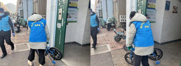 1月17日上午,五福家園社區(qū)城治委志愿者在日常巡查中巡查發(fā)現(xiàn),個(gè)別樓道門口還是存在居民隨意堆放雜物的問(wèn)題,當(dāng)下志愿者就聯(lián)系相關(guān)居民清理門口雜物,把違規(guī)停放的自行車電動(dòng)車輛搬出樓道,并停放到指定區(qū)域。