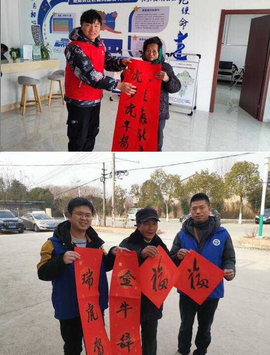 活動(dòng)現(xiàn)場,飄滿墨香。志愿者們飽含創(chuàng)作熱情,磅礴有力地?fù)]舞毛筆之間,為建設(shè)村村民送上虎年的“頭一份”最美好的祝福?;顒?dòng)現(xiàn)場的村民一邊感受著過年的喜慶氛圍,一邊贊揚(yáng)著書法家的技藝,迫不及待地排著隊(duì)等著拿大紅的“福”字和春聯(lián)。