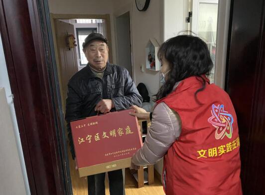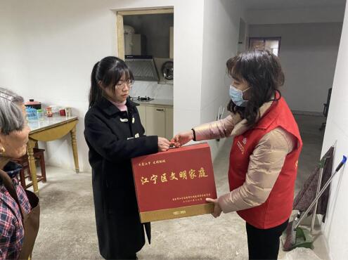新春將近,年味漸濃,近日,南京市江寧區(qū)淳化街道新華社區(qū)開展以“揚正氣 樹新風(fēng)”為主題的活動,新時代文明實踐志愿者為三戶家庭上門發(fā)放“文明家庭”的獎牌。