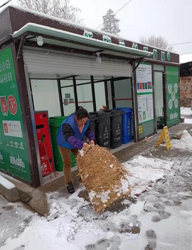 社區(qū)指導(dǎo)員一邊念叨著“瑞雪兆豐年”,一邊在垃圾分類站前掃雪,只見她先用鏟子極力推去門口的積雪,繼而撣落草甸上的雪塊,又將草甸一一鋪平,擺上小心防滑的提示牌,等待居民前來(lái)扔垃圾。由于老小區(qū)的緣故,居民多是老年人,防凍防滑最是重要,面對(duì)前來(lái)投放垃圾的居民,垃圾分類指導(dǎo)員熱情地與他們道了新年好,并耐心叮囑他們要小心地滑,慢慢走,盡量不要出門。