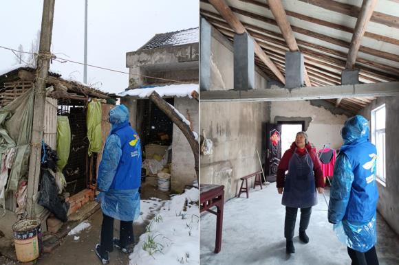 河南社區(qū)005網(wǎng)格員鄭冉來到村民張順珍老人家中,老人獨自居住,網(wǎng)格員認真查看房屋漏水情況,及危房隱患的排查,并且了解其生活狀況,提醒她雪天路滑,盡量不要外出,有事情聯(lián)系社區(qū),一定要注意安全。隨后網(wǎng)格員對轄區(qū)內的重點危舊房屋展開深入細致的現(xiàn)場排查,逐一向居住危舊房的村民宣傳雨雪天氣安全防范工作,提醒村民注意防范降雪可能造成的危害,宣傳安全用電取暖知識、群眾出行等系列安全知識,如有危險因及時離開房屋內保障生命安全,增強村民的自我保護意識。