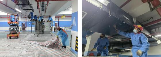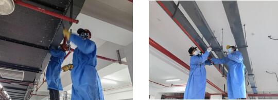 殘疾人志愿者們相互配合,施工現(xiàn)場(chǎng)有條不紊、井然有序。經(jīng)過(guò)了一個(gè)下午的努力,車(chē)庫(kù)的排風(fēng)管終于全都清理完畢,不能使用的管道被替換了下來(lái),并且將所有管道內(nèi)部都刷上了厚厚的防銹涂層。