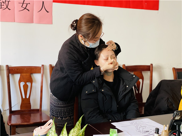 活動正式進(jìn)入主題,主講老師通過“內(nèi)在女神祈禱”和“外在養(yǎng)護(hù)分享”兩個環(huán)節(jié)的互動和分享。“我內(nèi)在的女神,我以我的性別為榮”、“我內(nèi)在的女神,我以我的情緒為榮”、“我內(nèi)在的女神,我以我的身體為榮”......養(yǎng)護(hù)環(huán)節(jié),老師教授現(xiàn)場女性如何使用撥筋棒進(jìn)行日常面部養(yǎng)護(hù)。