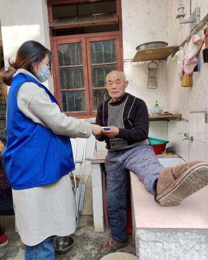 網(wǎng)格區(qū)內(nèi)殘疾人數(shù)量不少,其中一位村民腿部殘疾,無(wú)法自主行走,老人平日里和藹可親,待吳慧很好。吳慧便問(wèn)清了老人的狀況,尋求醫(yī)生的幫助,學(xué)會(huì)了很多適合腿部康復(fù)的按摩穴位和按摩小技巧。吳慧還帶老人一起就醫(yī),平時(shí)經(jīng)??赐先耍o老人送生活必需品,可以說(shuō)是做到了無(wú)微不至的關(guān)懷。