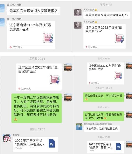 為了讓更多家庭知曉并主動(dòng)參與“最美家庭”活動(dòng),盛江社區(qū)婦聯(lián)執(zhí)委和網(wǎng)格員通過(guò)線上線下的方式加大宣傳力度,鼓勵(lì)居民通過(guò)自薦和推薦的方式積極參與尋找“最美家庭”的活動(dòng),主動(dòng)參與社區(qū)文化建設(shè),營(yíng)造和諧社區(qū)氛圍。