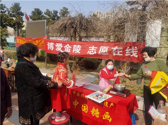 活動(dòng)現(xiàn)場(chǎng)最熱鬧的當(dāng)屬民俗區(qū),站點(diǎn)負(fù)責(zé)人邀請(qǐng)了非遺傳承人也同樣是南京市養(yǎng)老服務(wù)時(shí)間銀行志愿者隊(duì)伍的一員,只見(jiàn)她一邊控制著火候熬糖,一邊用工具甩糖、吹糖、作畫(huà),一個(gè)個(gè)精巧的人物、動(dòng)物和神話中的形象就出現(xiàn)在了他的手里。孩子們目不轉(zhuǎn)睛地看著這位民間藝術(shù)家,制作的時(shí)候,孩子們屏氣凝神,成品出現(xiàn)時(shí),孩子們歡呼雀躍。領(lǐng)到糖人的孩子開(kāi)心地欣賞著,舍不得吃,沒(méi)領(lǐng)到的孩子則眼巴巴地等著,“點(diǎn)單”自己想要的糖人形象??諝庵袕浡鸾z絲的糖味兒,也充斥著孩子們的歡聲笑語(yǔ)。
