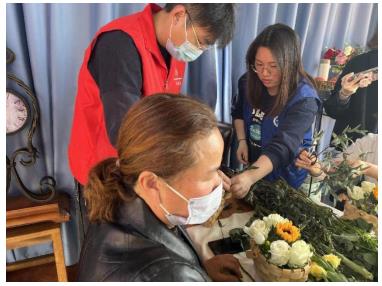 在志愿者的指導下,居民們發(fā)揮創(chuàng)造力,施展插花技能,搭配不同顏色的花朵,調(diào)整它們的位置。隨著時間的流逝,一件件春意盎然、清新淡雅的插花作品盛開在她們的手中?;顒游猜?,大家手捧自己親手制作的美麗花束合影留念,臉上洋溢著開心的笑容。