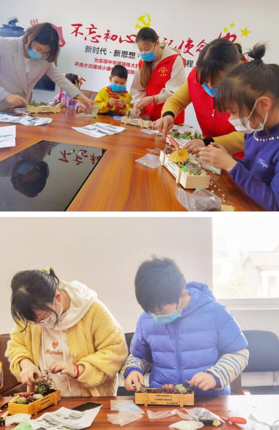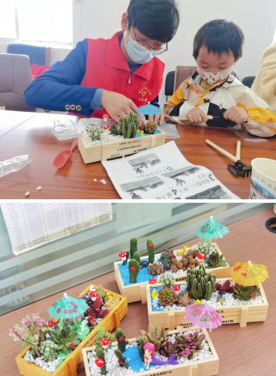 大家饒有趣味地制作起盆景,填土、鋪石、種植、擺放玩具……大家各自發(fā)揮想象,布局創(chuàng)作自己的盆中花園。伴隨著歡聲笑語(yǔ),一盆盆有模有樣的盆栽完成了,現(xiàn)場(chǎng)氣氛十分活躍。在多肉種植環(huán)節(jié)中,孩子們還不忘在花盆中插上一把小傘,為多肉植物遮風(fēng)擋雨。