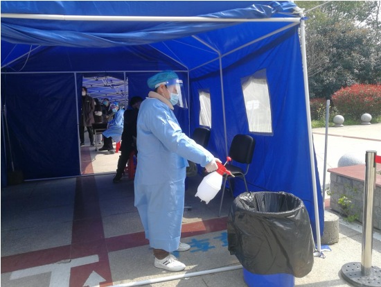 在核酸檢測出口處,很多人都在嘔吐,志愿者孟枝平不怕臟不怕累,在做好自身防護的同時,及時打掃現(xiàn)場垃圾,規(guī)范垃圾分類并對垃圾桶進行消毒。一天忙下來,腰酸腿疼,口罩換了一個又一個,但每個人服務熱情絲毫沒有減少,始終面帶微笑服務村民。