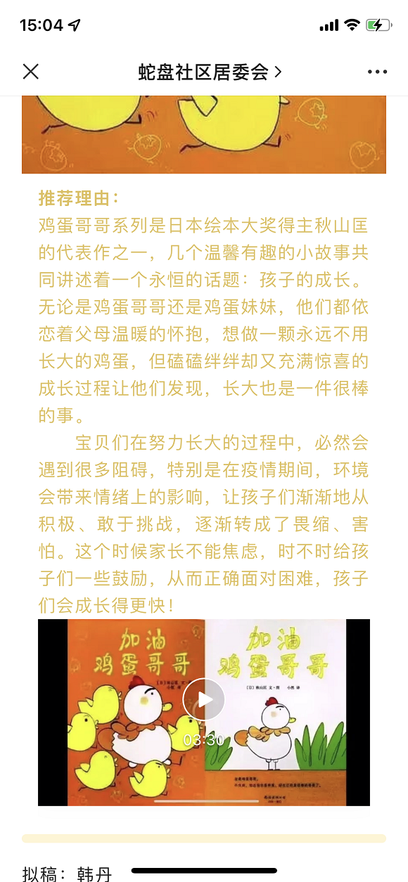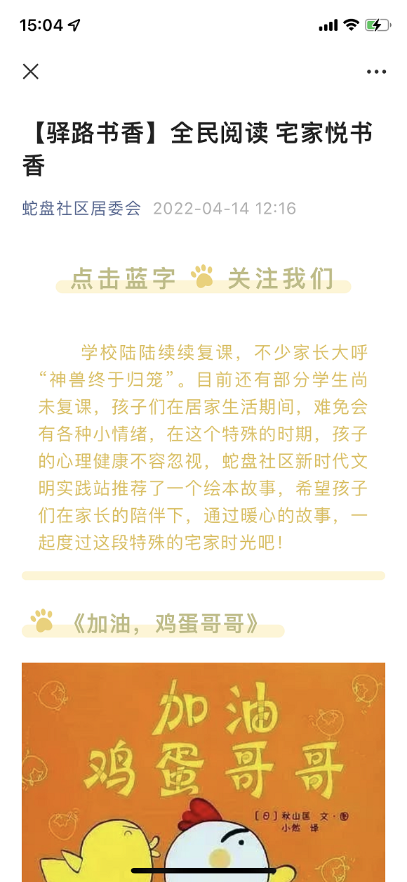 學(xué)校陸陸續(xù)續(xù)復(fù)課,不少家長(zhǎng)大呼“神獸終于歸籠”。目前還有部分學(xué)生尚未復(fù)課,孩子們?cè)诰蛹疑钇陂g,難免會(huì)有各種小情緒,在這個(gè)特殊的時(shí)期,孩子的心理健康不容忽視。4月14日,南京市棲霞區(qū)馬群街道蛇盤社區(qū)新時(shí)代文明實(shí)踐站開(kāi)展“全民閱讀 宅家悅書香”活動(dòng),通過(guò)推薦繪本故事,引導(dǎo)孩子們?cè)诩议L(zhǎng)的陪伴下,通過(guò)暖心的故事,一起度過(guò)這段特殊的宅家時(shí)光。