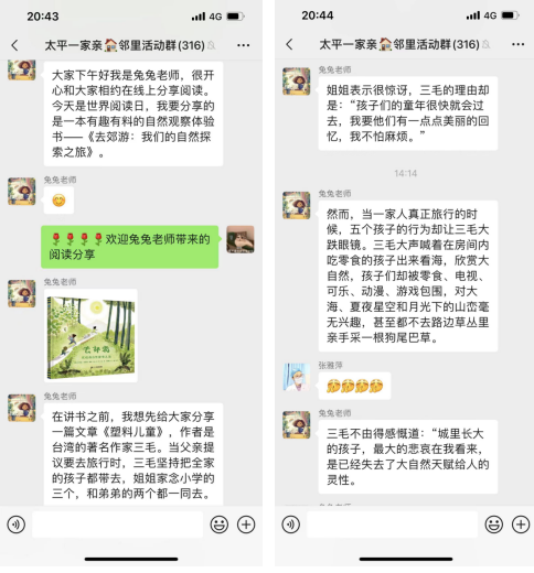 本次活動采取“線上”形式,引導(dǎo)居民群眾、特別是父母兒童自行開展閱讀,通過微信群、朋友圈分享閱讀內(nèi)容和閱讀心得,并推薦好書好章節(jié)?;顒又校猛美蠋煼窒砼_灣著名作家三毛所寫的“塑料兒童”這一小故事,并分享了一本超有料的科普新童圖畫書《去郊游》。居民朋友們積極參與,掀起家庭閱讀的熱潮。